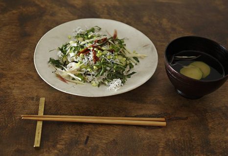 混ぜ寿司に、ドライトマトをトッピング。しらすの塩分と、トマトの旨味を生かすため酢は少なめにするのがポイント。香り野菜を散らして、さっぱりと仕上げます。